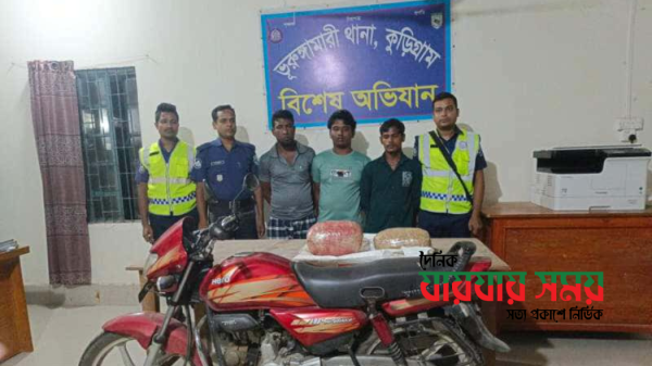 কুড়িগ্রামের ভুরুঙ্গামারীতে ৬ কেজি ভারতীয় গাঁজাসহ শ্বশুর, জামাই ও ভাগ্নেকে গ্রেফতার করেছে থানা পুলিশ। শুক্রবার (২৫ অক্টোবর) গভীর রাতে উপজেলার সদর ইউনিয়নের বাগভান্ডার গ্রামে অভিযান চালিয়ে তাদের আটক করা হয়।