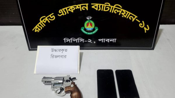 পাবনায় র্যাপিড অ্যাকশন ব্যাটালিয়ন (র্যাব)-১২ এর অভিযানে একটি বিদেশি রিভলভারসহ দুইজনকে গ্রেফতার করা হয়েছে। র্যাব জানায়, গত বুধবার (২৮ জানুয়ারি) সন্ধ্যা ৭টা ৪০ মিনিটে র্যাব-১২, ক্রাইম প্রিভেনশন কোম্পানি-২ পাবনার একটি